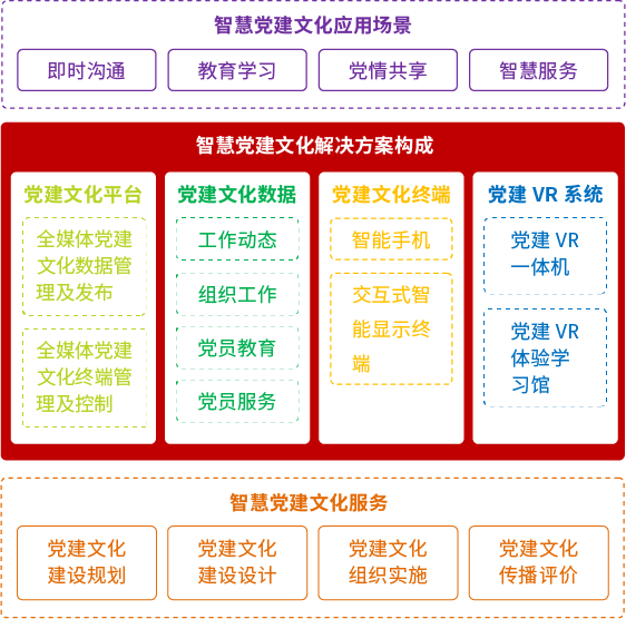 “智慧党建文化解决方案”创新发展党建文化,将互联网、云计算、大数据、物联网、VR 等信息化技术与党建文化深度融合,
